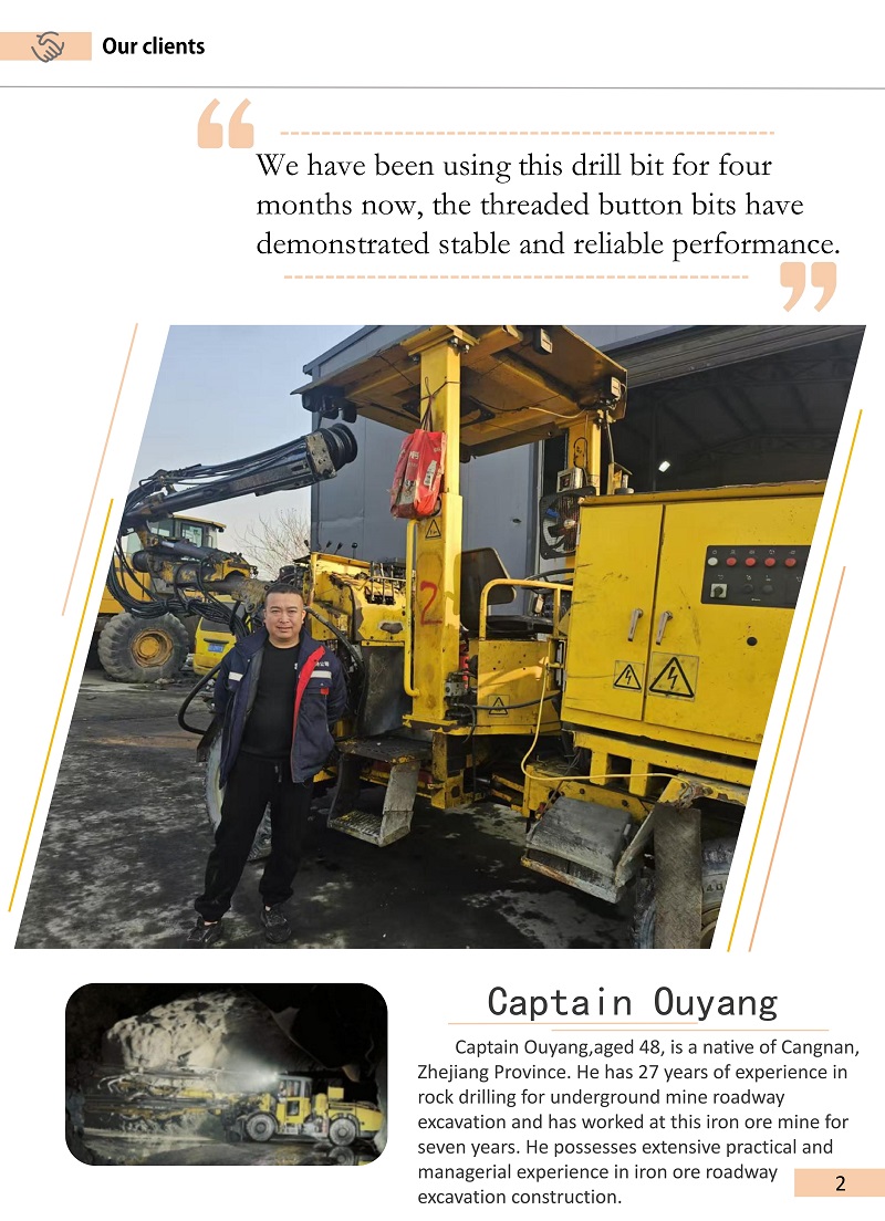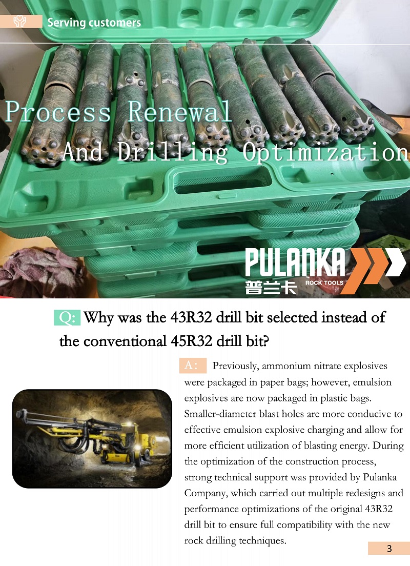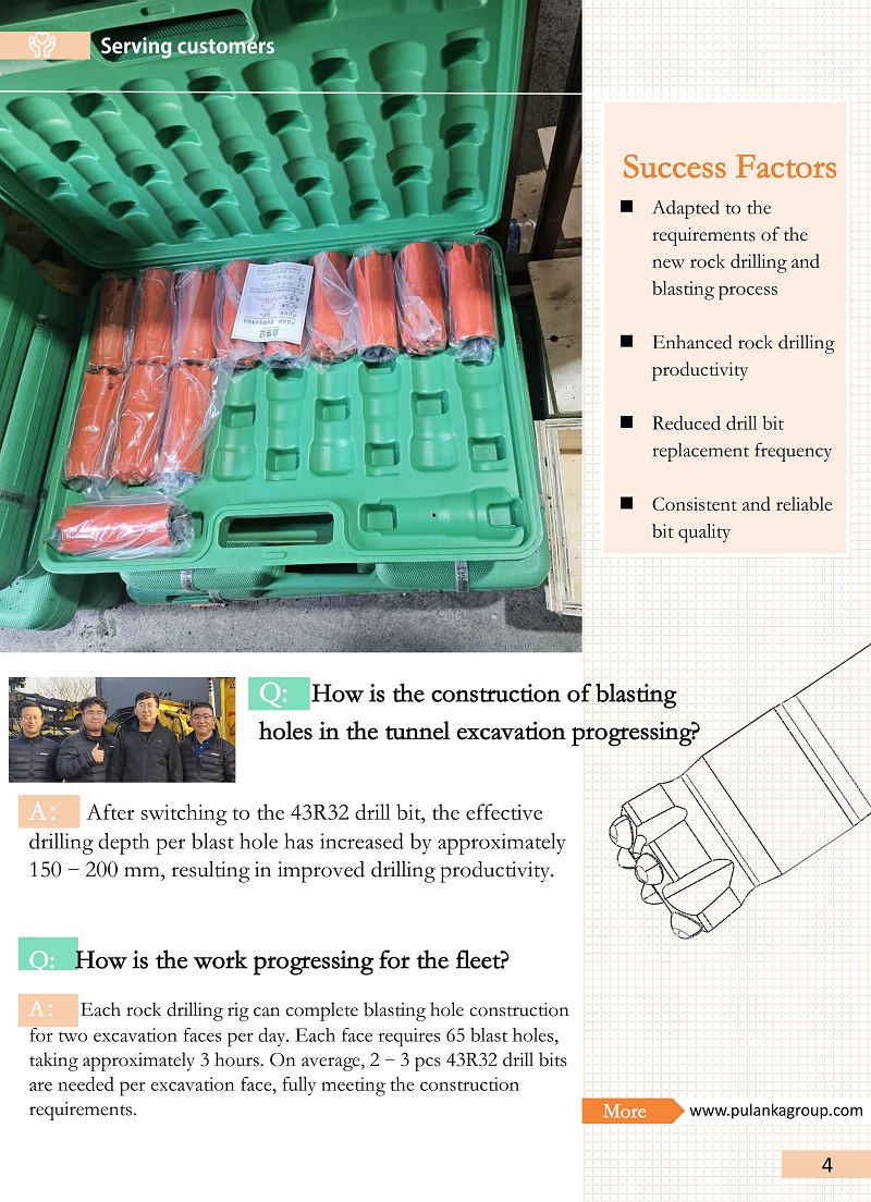 Results:After switching to the 43R32 drill bit, the effective drilling depth per blast hole has increased by approximately 150–200 mm, resulting in improved drilling productivity.Each rock drilling rig can complete blasting hole construction for two excavation faces per day. Each face requires 65 blast holes, taking approximately 3 hours. On average, 2–3 pcs 43R32 drill bits are needed per excavation face, fully meeting the construction requirements.